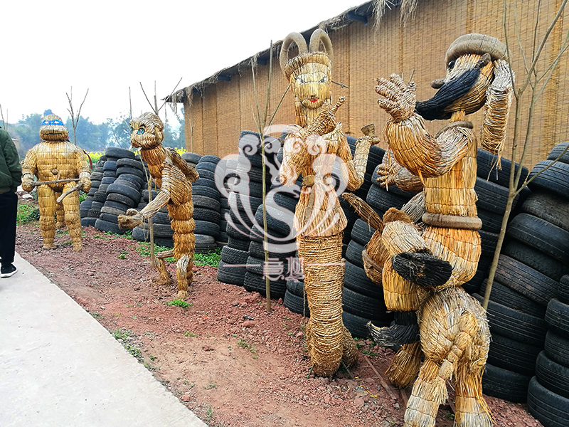現在的精致稻草人藝術通常是由專業美術老師的造型放樣,然后由焊工師傅焊接出立體造型造型,然后以稻草或者稻草繩為材料編捆制作而成。