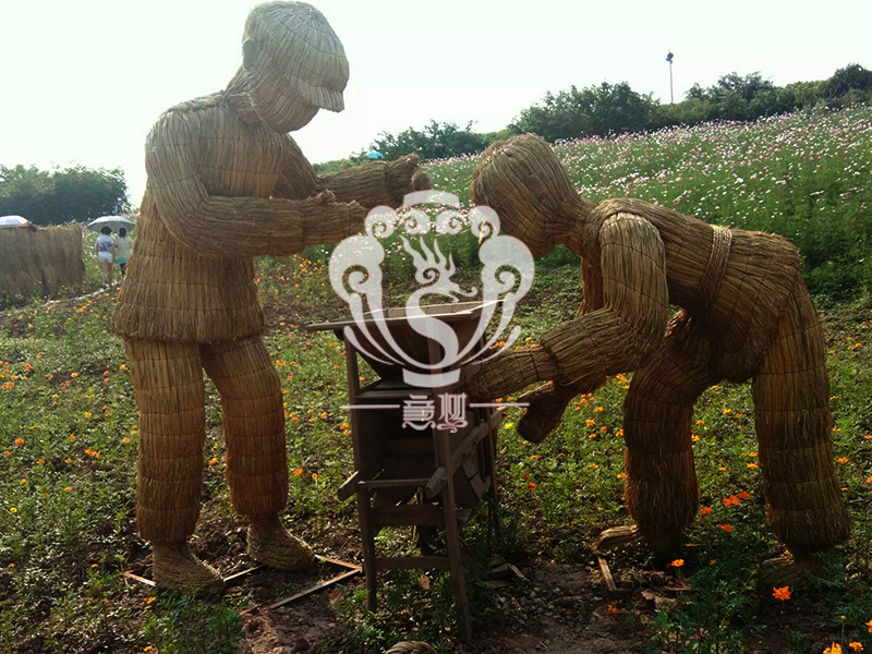 現在的精致稻草人藝術通常是由專業美術老師的造型放樣,然后由焊工師傅焊接出立體造型造型,然后以稻草或者稻草繩為材料編捆制作而成。