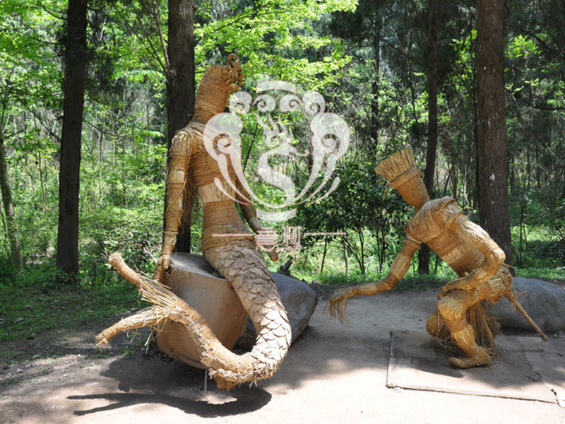 現在的精致稻草人藝術通常是由專業美術老師的造型放樣,然后由焊工師傅焊接出立體造型造型,然后以稻草或者稻草繩為材料編捆制作而成。
