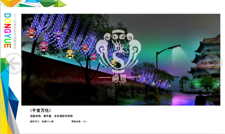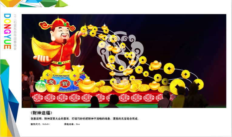 滿懷喜悅,深感榮幸。自貢市意樹文化傳播有限公司通過對湖北荊州石首東岳寺的實地考察,和我們的不懈努力,《湖北荊州石首東岳寺首屆迎春燈會方案》設計工作圓滿完成。我們結合東岳寺特色及氛圍營造亮化區(qū)域地形地貌,緊抓“歡慶佳節(jié)”的設計主題,把迎春燈會精心打造成2017年迎春的亮點,獻上盛大的視覺歡樂盛宴!