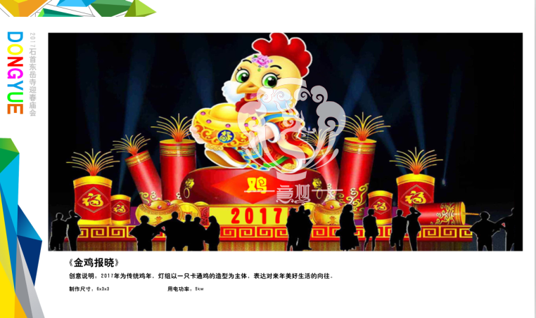 本屆燈會的策劃、設計將傳統性、科技性、環(huán)保性集為一體,運用現代光源科技表現,使得燈景相映,把本屆燈會打造成一個雅俗共賞、生動活潑的雞年燈景和禮佛世界。我們緊緊圍繞中國彩燈照亮東岳寺主題,從東岳寺當地文化延伸至今。科技主題,將荊南多姿多彩的城市風情、名俗風物,經彩燈特有表現手法精準獨到的鋪陳,靈動細膩的變化,深入淺出的詮釋,不僅讓全市人民看到裝飾一新的東岳寺,也能讓來自五湖四海的游客和回家過年的游子在賞燈的同時,增強對荊南近年來巨大變化的了解,勢必成為促進荊南地區(qū)與各界交流的一個新橋梁,為荊南的和諧、蓬勃發(fā)展增輝添彩。