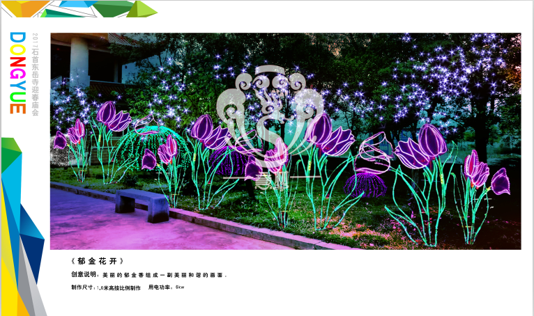 本次設計方案形式新穎、亮點突出、格調高雅,與“迎春、禮佛”的主題環(huán)環(huán)相扣,喜慶的節(jié)日氛圍在這交相輝映的盛世燈組中得到體現,讓整個東岳寺充滿著舞動心弦的魅力。透過本次高品位氛圍體會到時代發(fā)展為人們帶來了更新、更加美好的幸福生活。