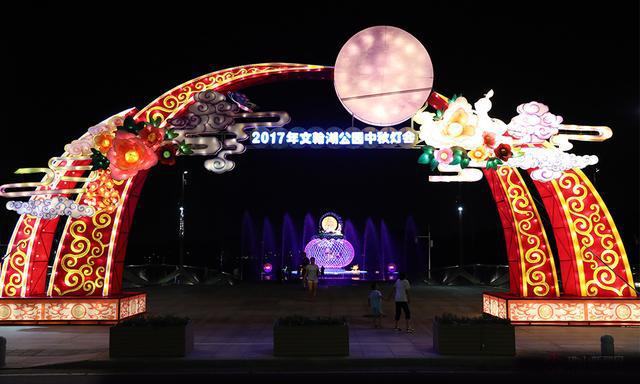 文翰湖中,噴泉中心,一座以"嫦娥奔月"為設計主題燈飾閃耀。律動的噴泉,嫻靜的燈飾,微風下泛起漣漪的湖水,動靜搭配,一切都顯得別樣的清雅柔和,而又搭配中秋的氣息。