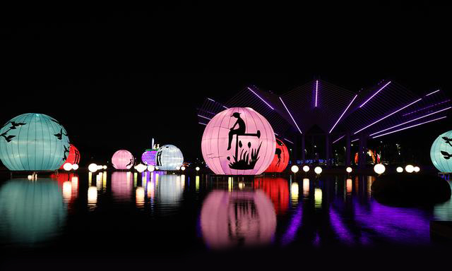 "水月鳳凰"觀賞臺附近湖面,一組以圓月為設計元素,繽紛色彩搭配的彩燈展現美態。在燈光的作用下,彩燈投影出戀人的剪影,一個個相依的身影,唯美浪漫。