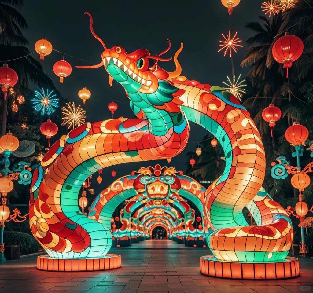 那一盞盞精心制作的新春蛇年花燈會,以其獨特的造型和絢麗的色彩,瞬間抓住了人們的目光。巨大的蛇形彩燈高高聳立,它的身軀蜿蜒曲折,鱗片在燈光的映照下熠熠生輝,仿佛一條靈動的神蛇降臨人間。蛇首高高昂起,眼神中透露出威嚴與神秘,仿佛在守護著這片歡樂的土地。