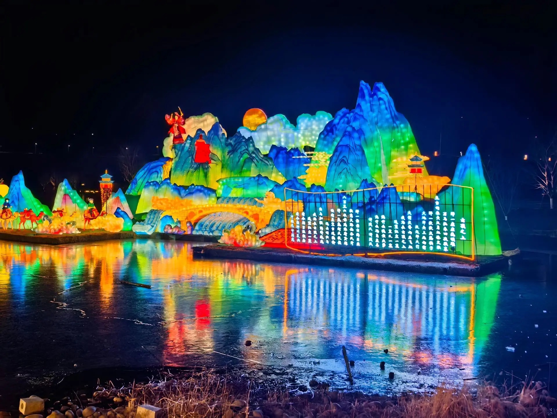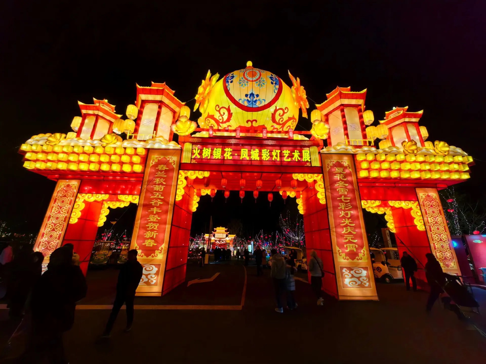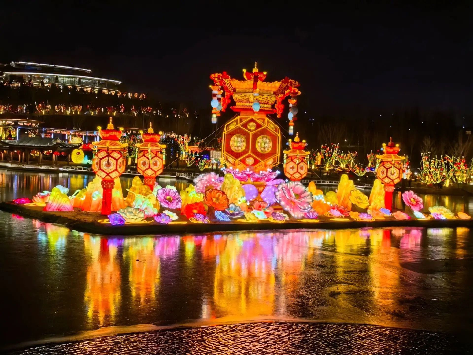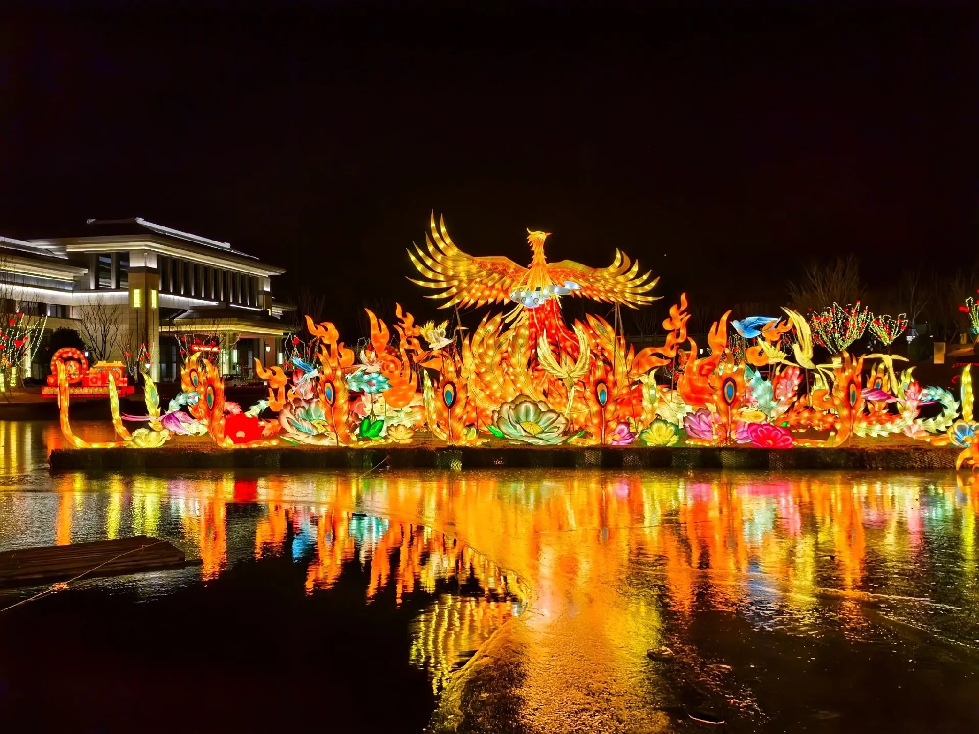 燈展現(xiàn)場,千燈萬盞與龍馬湖的山、水、橋景相映成趣,構(gòu)筑成一幅絕美的新春光影畫卷。高達十二米的“富貴平安”燈組喜慶洋溢,五顏六色的牡丹花團錦簇,成為全場焦點;