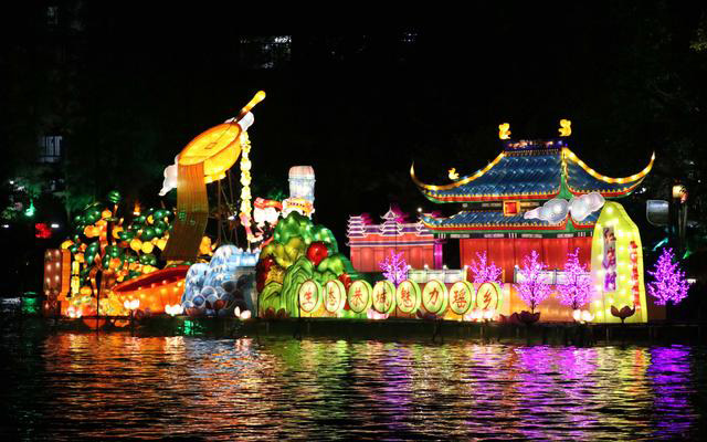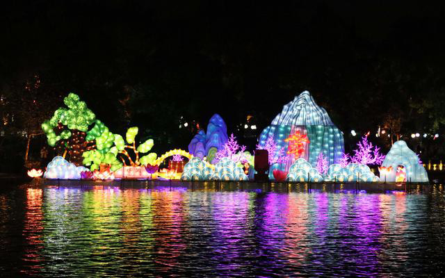 藝術花燈展主角當然是花燈。此次展出的花燈包括23個設于湖面的大型展燈,以及多個路面花燈、展燈、花燈拱門等