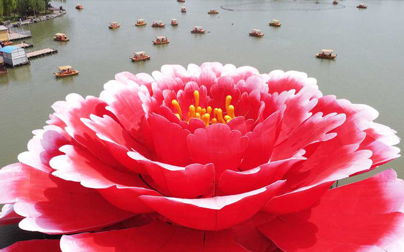 4月16日,河南省洛陽市隋唐城遺址植物園滴翠湖,一朵直徑36米,高13米的巨型牡丹造型亮相,吸引游客紛紛前來打卡。據介紹,這朵巨型牡丹“培育”歷時30天,花型以洛陽本土牡丹“洛陽紅”為參考,內部有燈光裝置,可供游客晚上觀賞。